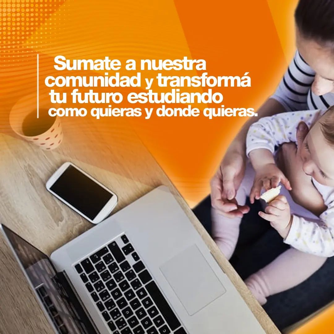 Cursas 100% online, desde tu casa, sin horarios, con acompañamiento permanente.